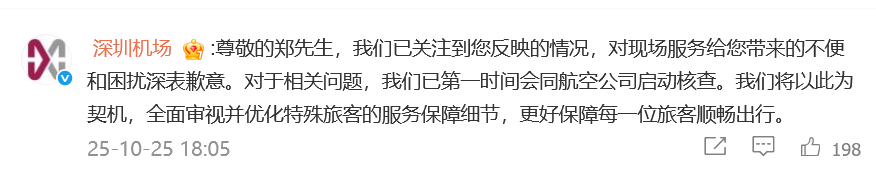 10月25日晚间,深圳机场官方微博在歌手郑智化的评论区留言致歉:尊敬的郑先生,我们已关注到您反映的情况,对现场服务给您带来的不便和困扰深表歉意。对于相关问题,我们已第一时间会同航空公司启动核查。我们将以此为契机,全面审视并优化特殊旅客的服务保障细节,更好保障每一位旅客顺畅出行。